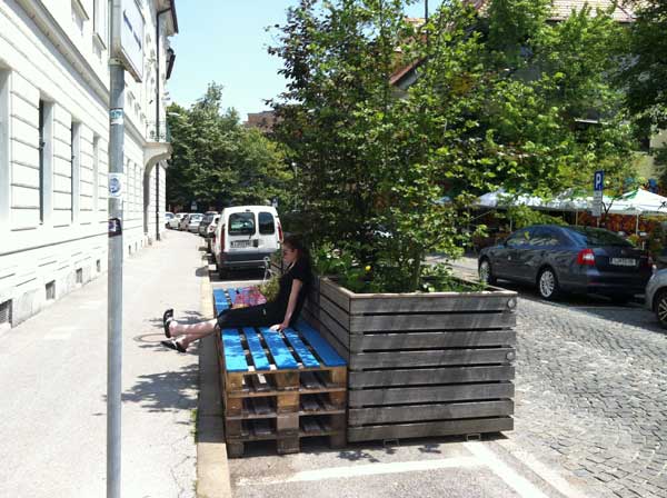 Projekt ‘Parkplac’ uključuje postavljanje kombinacije klupa i zelenila na različitim lokacijama parkirališta u gradu, unoseći promjenu u jednolične sadržaje asfaltnih površina specifične namjene. Objekt je dizajnerski dojmiljiv i dobro kadriran, klupa i posude sa stablima sačinjene su od korištenih drvenih paleta, a četiri longitudinalno postavljene palete zauzimaju upravo jedno parkirališno mjesto. Ove dosjetljive oaze u ‘urbanoj pustinji’ asfalta omogućuju ljudima predah, na klupi mogu odložiti vrećice i torbe, roditelji koji šetaju s djecom mogu sjesti, a oni koji šetaju s kućnim ljubimcima mogu ih tu pomaziti, grupe mladih mogu se tu sastati i družiti… Tisuću mogućnosti za korištenje (i tu ima mjesta dosjetljivosti), ali već i vizualno, kao iznenađujuća forma, simbolični ‘Park na Parkingu’ ostvaruje svoju humanu emancipacijsku ulogu.
