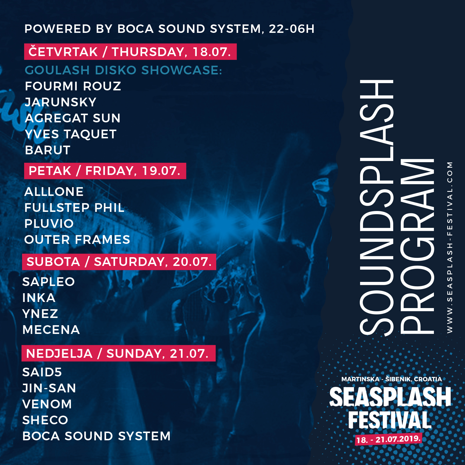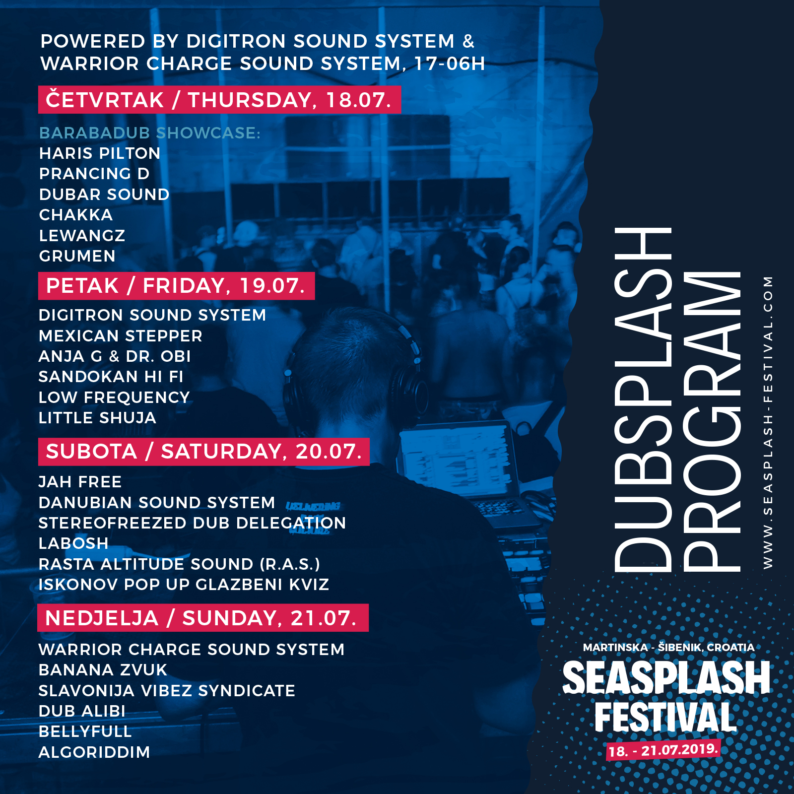 Za tjedan dana Martinska, nova festivalska lokacija u srcu Dalmacije po prvi put će ugostiti Seasplash festival, čije će se 17. izdanje održati od 18. do 21. srpnja. Seasplash festival “okupirat” će plažu i rt Martinska, tik preko puta Šibenika, svojim živopisnim pozornicama na koje će se popeti međunarodne legende dub i reggae glazbe kao što su Lee “Scratch” Perry, Adrian Sherwood, Scientist i Mad Professor, ali i niz regonalnih i domaćih imena. Glazbeni gosti i publika iz cijelog svijeta moći će uživati u četiri festivalska dana, ispunjena dobrom glazbom, dnevnim radionicama, bazzarom, u opuštenoj atmosferi po kojoj je Seasplash poznat, a poseban vizualni dojam festivala dat će i umjetnička kolonija ArtSplash. Nedavno objavljenom rasporedu na glavnoj festivalskoj pozornici – MainSplashu, sada pridružujemo i raspored DubSplash i SoundSplash pozornice te još dvadesetak novih imena.