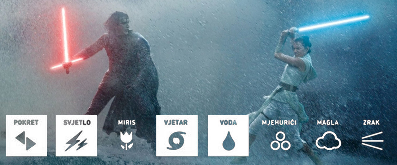 Skakanje Millenium Falconom kroz hiperprostor na početku filma neodoljivo podsjeća na počast Star Tours atrakciji u Disneylandu (o njoj smo pisali, vidi LINK, a zanimljivo je da je već osvježena destinacijama iz novog filma). Doduše hidraulički kontrolirana sjedala u 4DX-u ne mogu dočarati centrifugalnu silu i gravitaciju kao simulator leta na Star Toursu, ali su sasvim solidan nadomjestak. Uz letenje svemirskih brodova, učinkovito se koriste za nadopunjavanje pokreta kamere (pomičete se s kamerom) ili dramaturški učinak (sjedala se nagnu unatrag da bi se dočarao dojam nestajanja tijela, odnosno odlaska “u nebo” – u ovom slučaju u “Force”).