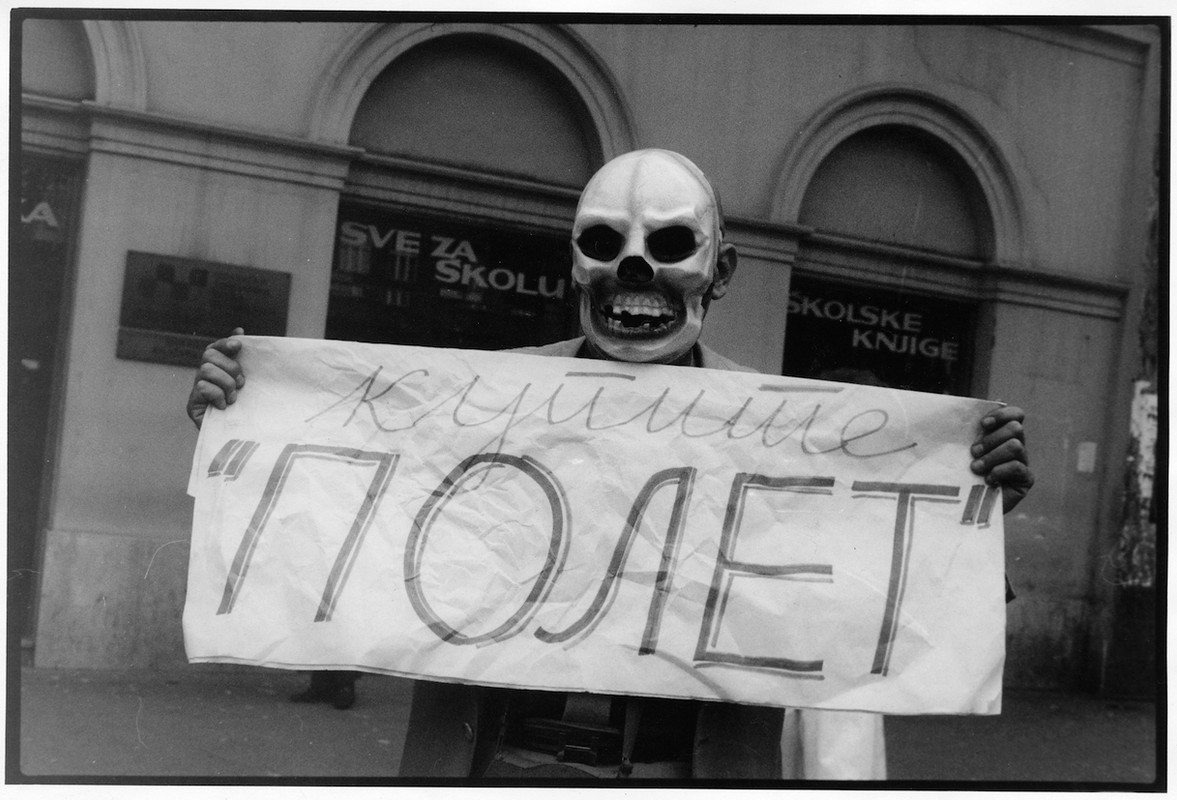 Maska smrti (kolportiranje Poleta) _ Death Mask (Selling Polet Newspaper)_ performans _ performance_ Zagreb, 1984. Foto_ _ Photo_ Nino Semialjac_ Ljubaznošću Instituta Tomislav Gotovac, Zagreb