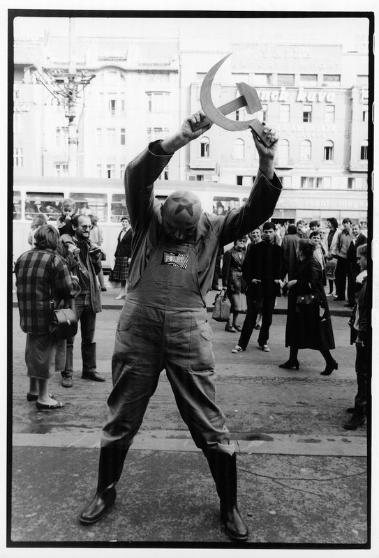 Srp, čekić i crvena zvijezda (kolportiranje Poleta) _ Sickle, Hammer and Red Star (Selling Polet Newspaper)_ performans _ performance_ Zagreb, 1984. Foto_ _ Photo_ Nino Semialjac_ Ljubaznošću Instituta Tomislav Gotovac, Zagreb