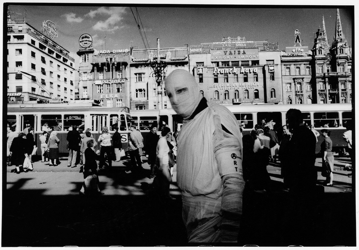 Mumija (kolportiranje Poleta) _ Mummy (Selling Polet Newspaper), performans _ performance_ Zagreb, 1984. Foto_ _ Photo_ Nino Semialjac_ Ljubaznošću Instituta Tomislav Gotovac, Zagreb