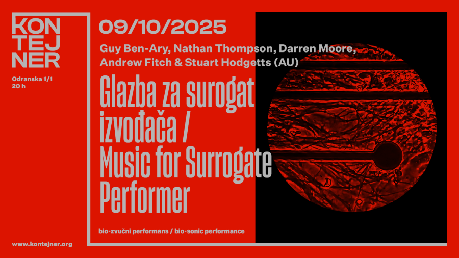 Samo nekoliko dana nakon robotskog koncerta, KONTEJNER donosi dvije nesvakidašnje bio-zvučne izvedbe. Prva je Glazba za surogat izvođača, performans australskog umjetnika Guya Ben-Aryja i suradnika Nathana Thompsona, Darrena Moorea, Andrewa Fitcha i Stuarta Hodgettsa, koji će se održati u četvrtak, 9. listopada 2025. u 20 sati. Projekt je posvećen legendarnom skladatelju Alvinu Lucieru i njegovoj kultnoj skladbi Music for Solo Performer (1965.), u kojoj su moždani valovi pokretali rezonantne udaraljke. Naručen za Venecijanski bijenale 2023., projekt je nastao nakon što je Lucier 2020. umjetnicima darovao uzorak krvi iz kojeg su uzgojene žive neuronske mreže – njegov “in vitro mozak”.